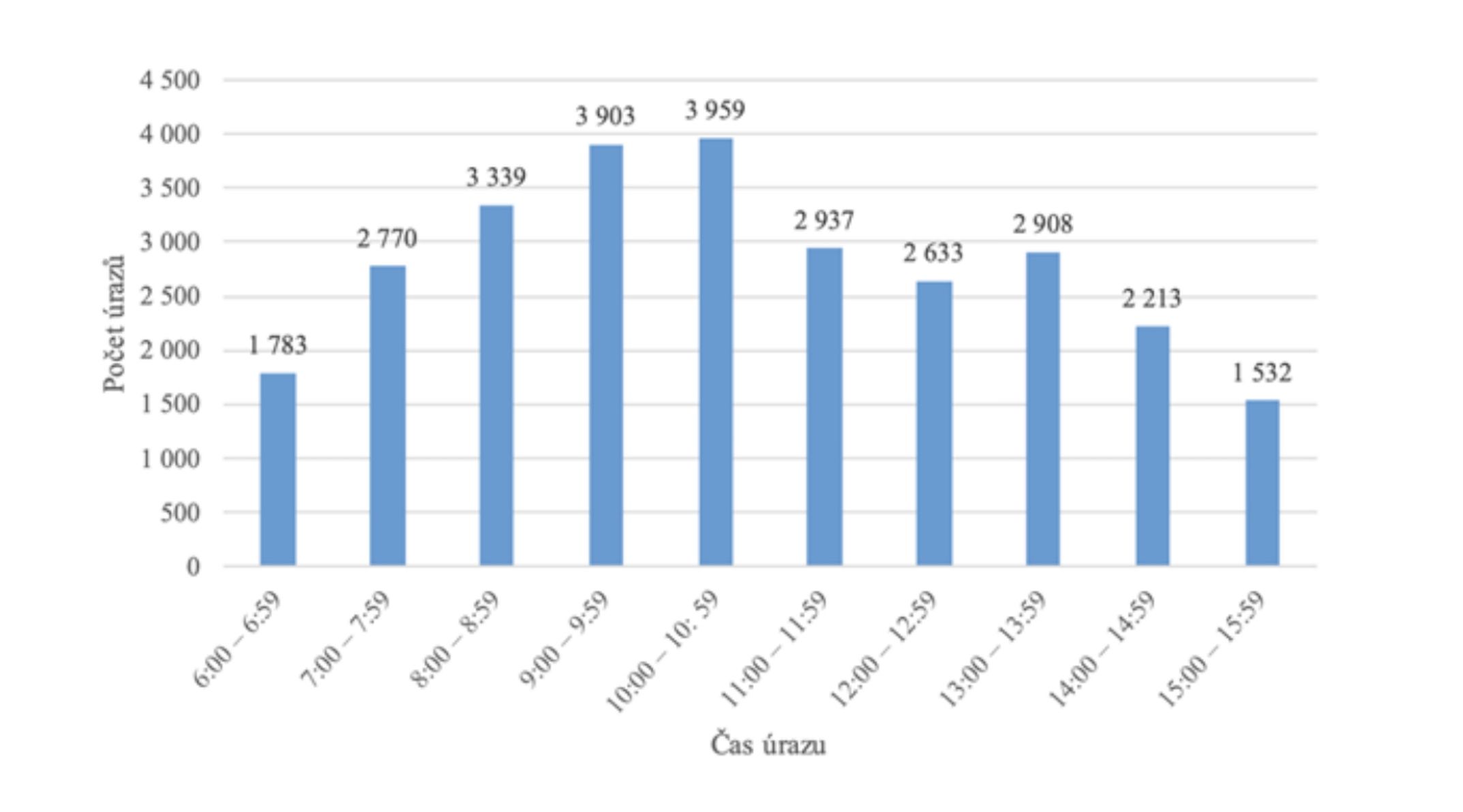 Kritická hodina: 10:00 – 10:59 Za nejkritičtější dobu dne můžeme i nadále na základě posledních dostupných podrobných dat z roku 2021 označit interval mezi desátou a jedenáctou dopoledne, kdy se stane jednoznačně nejvíce úrazů.