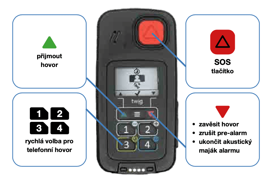 Jakmile zařízení TWIG vyhodnotí nebezpečnou situaci – například pád, znehybnění nebo ztrátu vědomí – okamžitě spustí přednastavený bezpečnostní scénář: